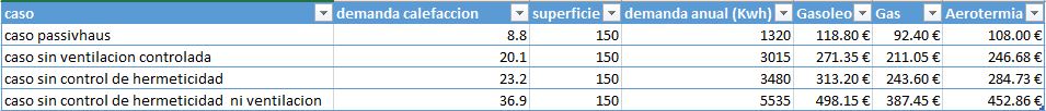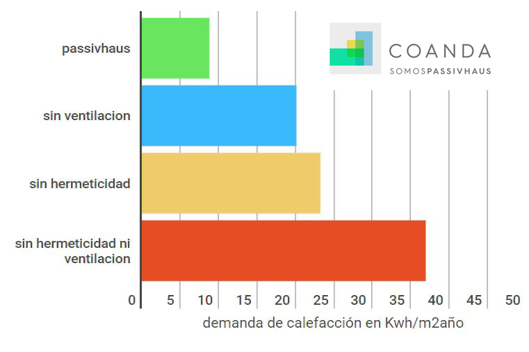 Resulta significativo, que en una vivienda con unos niveles de aislamiento muy altos el hecho de no tener en cuenta la ventilación y la hermeticidad, que es lo que habitualmente se hace en la mayoría de las viviendas, aumenta la demanda de calefacción en un 319% con respecto a passivhaus, con el mismo diseño y aislamientos.